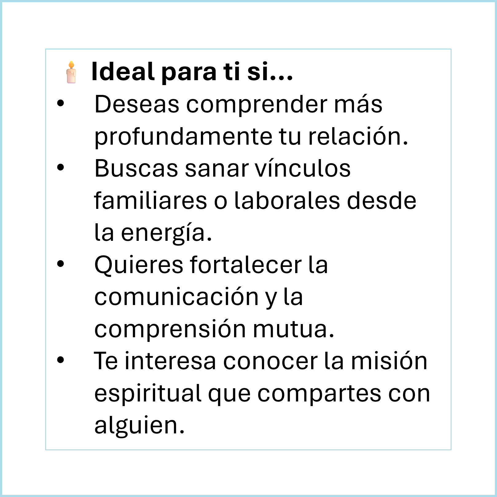Cada alma vibra con una frecuencia única, y cuando dos caminos se cruzan, sus energías comienzan a danzar. La Compatibilidad entre Números te permite comprender la relación energética entre tú y otra persona —ya sea pareja, amistad, familiar o socio—, revelando los aprendizajes, retos y fortalezas que surgen del vínculo. A través de la numerología espiritual, Paola interpreta las vibraciones principales de ambas fechas de nacimiento para mostrar cómo se complementan, en qué aspectos se desafían y cuál es la misión compartida que los une.