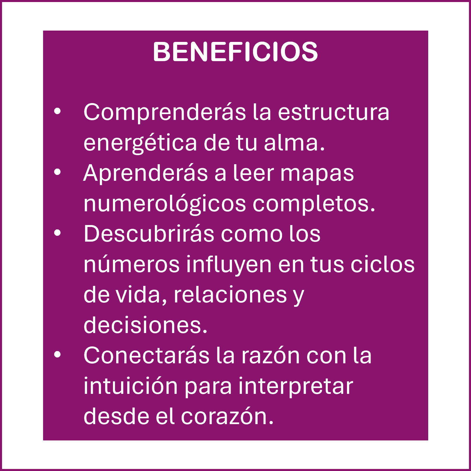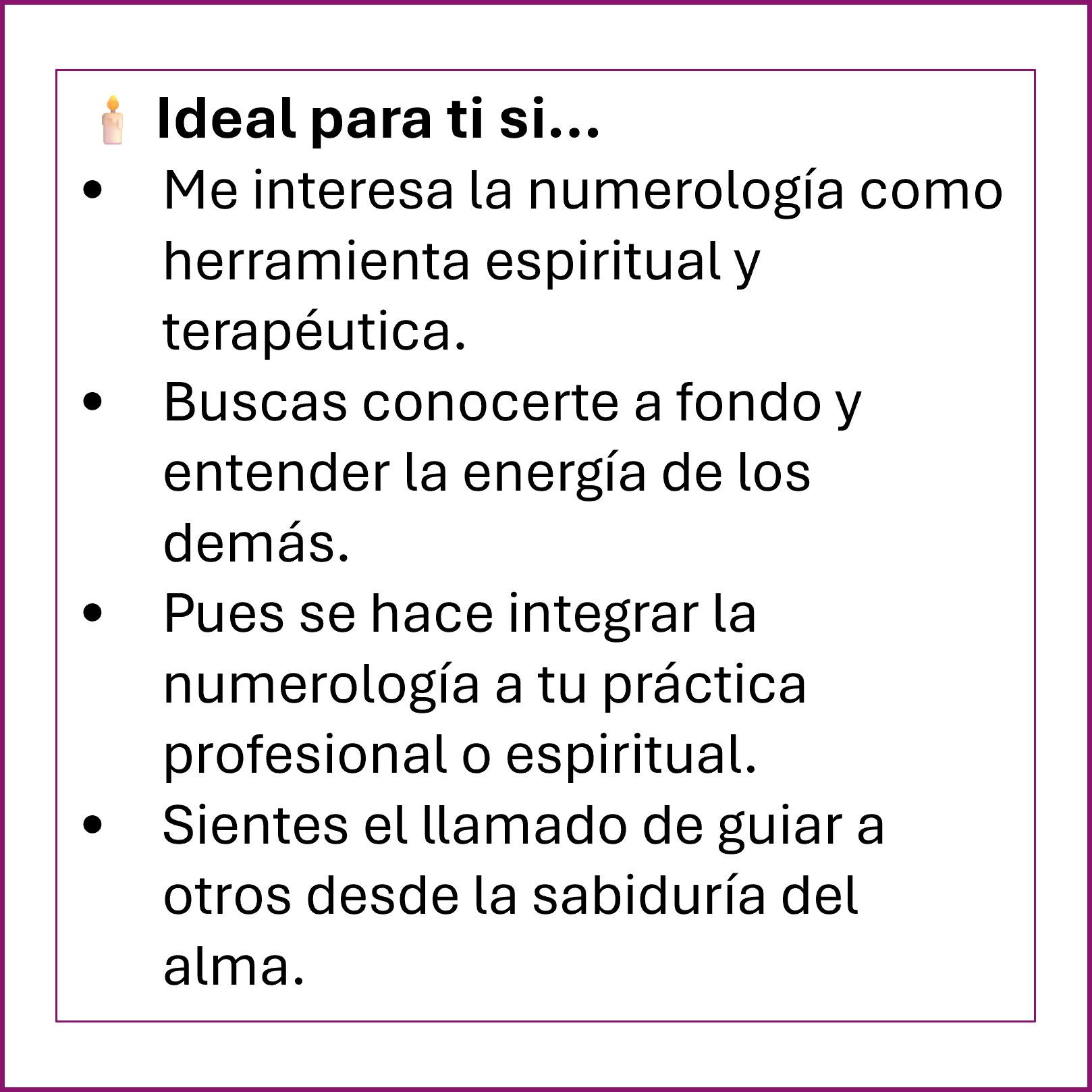 Los números no solo hablan de cantidades: son códigos sagrados que revelan la vibración del alma. En este Curso de Numerología Espiritual, se te guía paso a paso para comprender la energía detrás de tu fecha de nacimiento y de tu nombre, ayudándote a descubrir tu propósito, tus dones, tus aprendizajes y la manera en que te relacionas con el mundo. Aprenderás a interpretar mapas numerológicos completos —propios y de otras personas— para acompañar procesos de crecimiento personal, conexión espiritual y transformación interior. Este curso es una experiencia profunda de autoconocimiento y expansión de conciencia, que te permitirá ver la vida con nuevos ojos: los de tu alma.