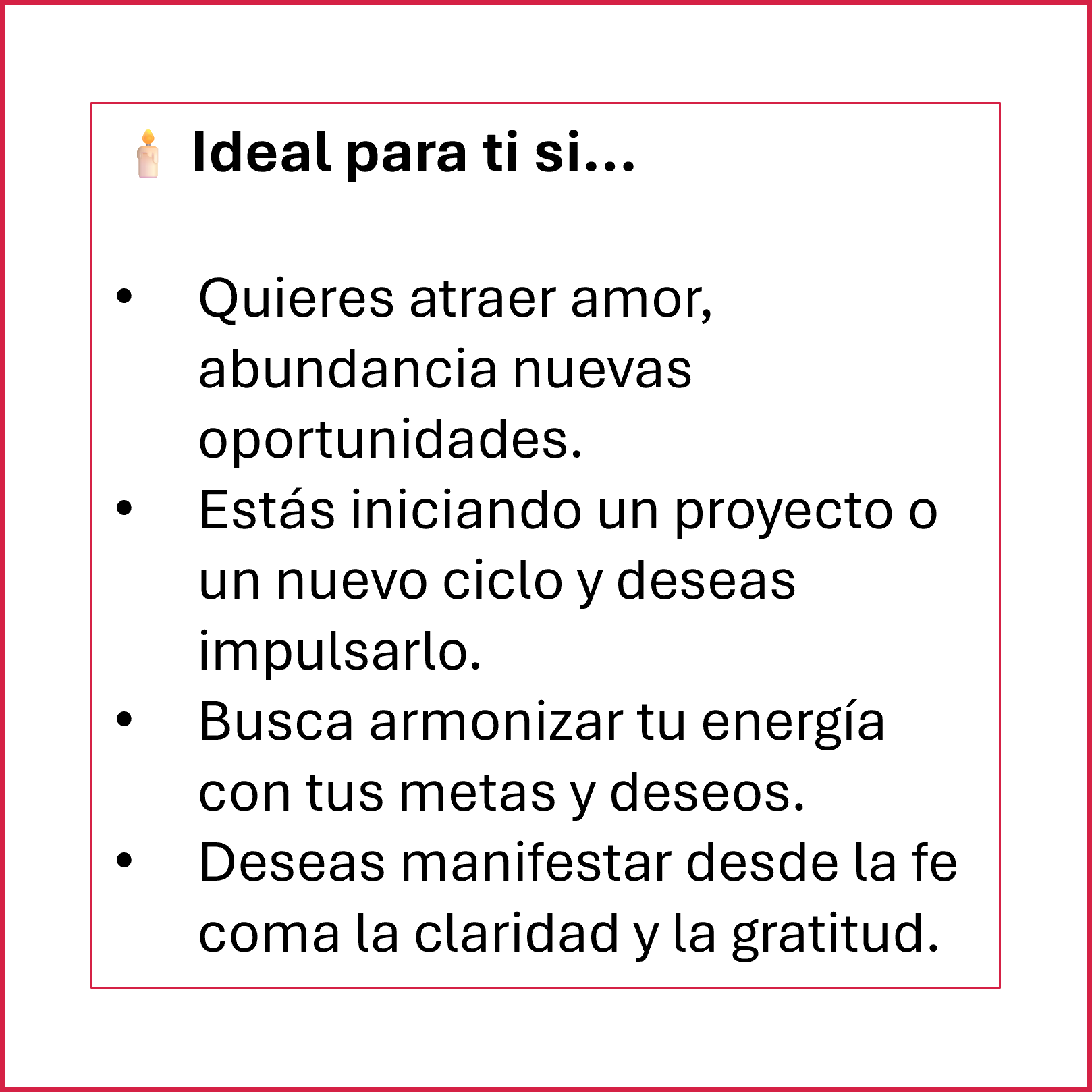 El universo responde a la energía que emites. El Ritual de Atracción y Manifestación te guía para alinear tu vibración con la frecuencia del amor, la abundancia y la prosperidad, ayudándote a atraer hacia ti aquello que realmente deseas desde tu corazón. A través de una ceremonia personalizada con velas, hierbas, cuarzos, afirmaciones y símbolos sagrados, se crea un espacio de intención consciente para activar tu poder creador y manifestar con propósito. Este ritual te enseña a sembrar tu intención, elevar tu energía y abrir tus caminos con claridad y confianza.