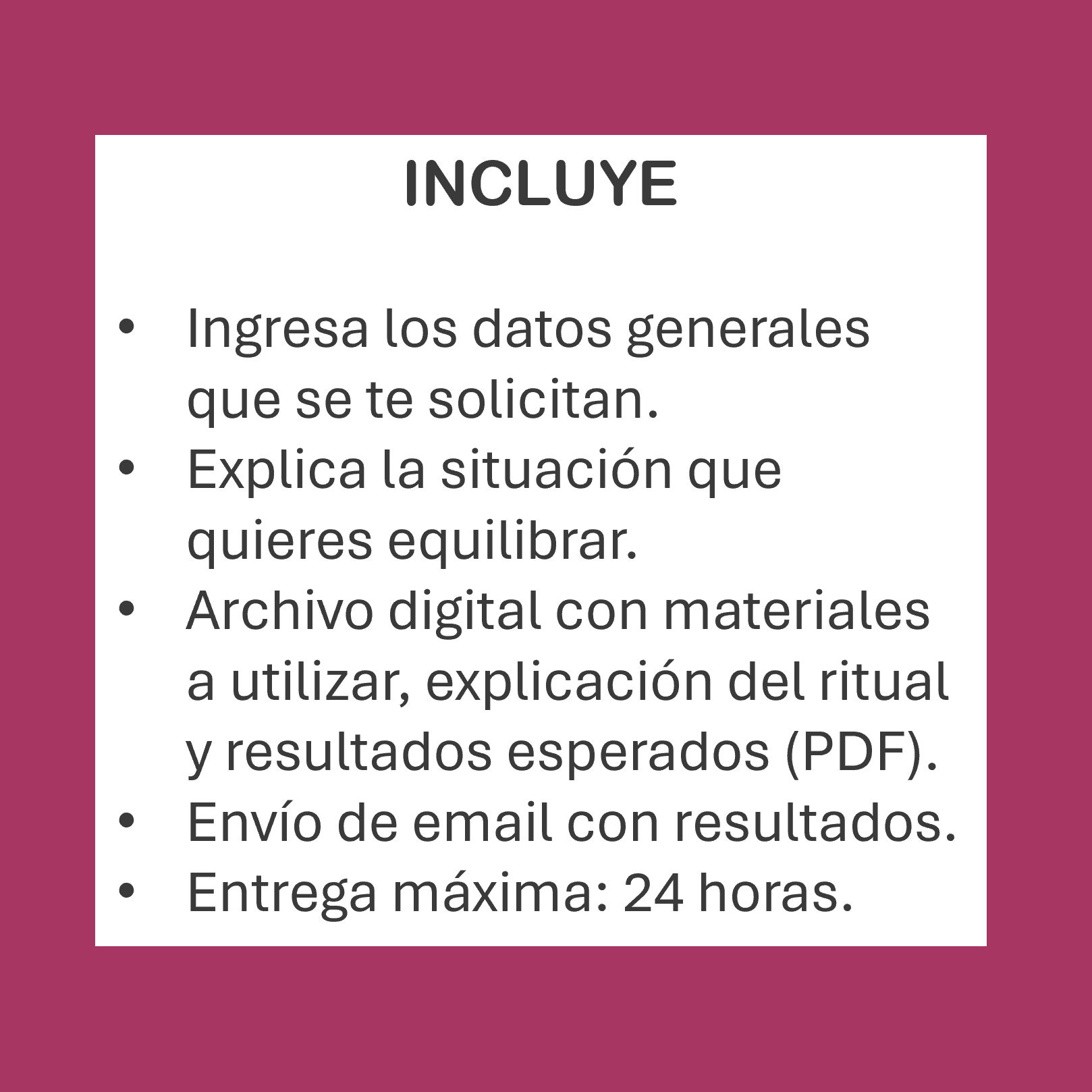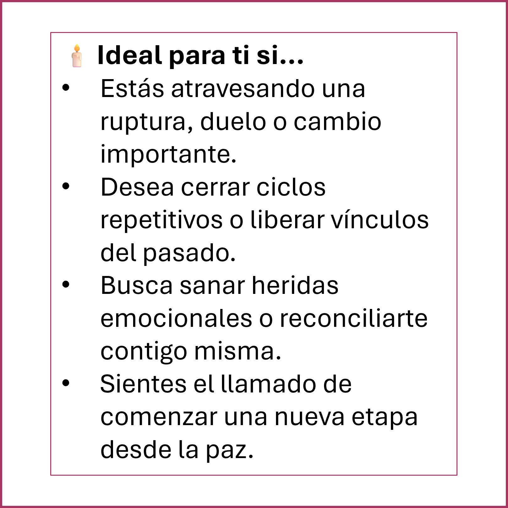 Cada final guarda el inicio de una nueva historia. El Ritual de Liberación y Cierre de Ciclo está creado para acompañarte a soltar relaciones, emociones, etapas o experiencias que ya cumplieron su propósito, permitiéndote sanar, perdonar y abrir espacio para lo nuevo. A través de un proceso amoroso y conscien te, canaliza y diseña un ritual personalizado que combina velas, hierbas, cuarzos, escritura y afirmaciones, ayudándote a liberar el pasado y recuperar tu poder interior. Este ritual es un acto simbólico y profundamente sanador, ideal para cerrar con gratitud lo que fue y abrir el corazón a lo que viene.