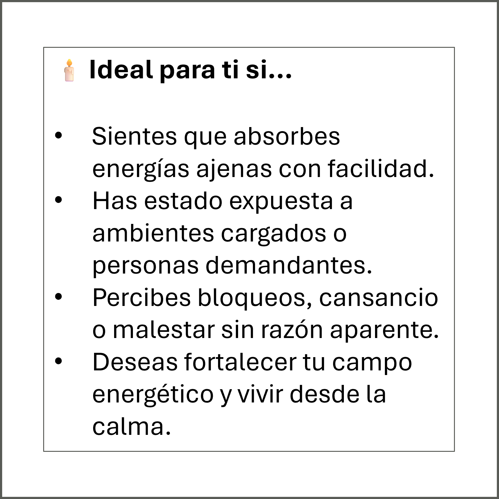 Tu energía es sagrada y merece ser cuidada. El Ritual de Protección Energética está diseñado para blindarte ante envidias, energías densas, pensamientos negativos o ambientes cargados, ayudándote a mantener tu luz interior estable, fuerte y protegida. A través de una ceremonia simbólica y elementos consagrados —como amuletos, velas, oraciones e invocaciones—, Se canaliza un ritual personalizado para activar un campo de protección energética que te acompaña en tu día a día. Este ritual crea un escudo de luz y fortaleza, recordándote que tu poder interno es tu mejor defensa.