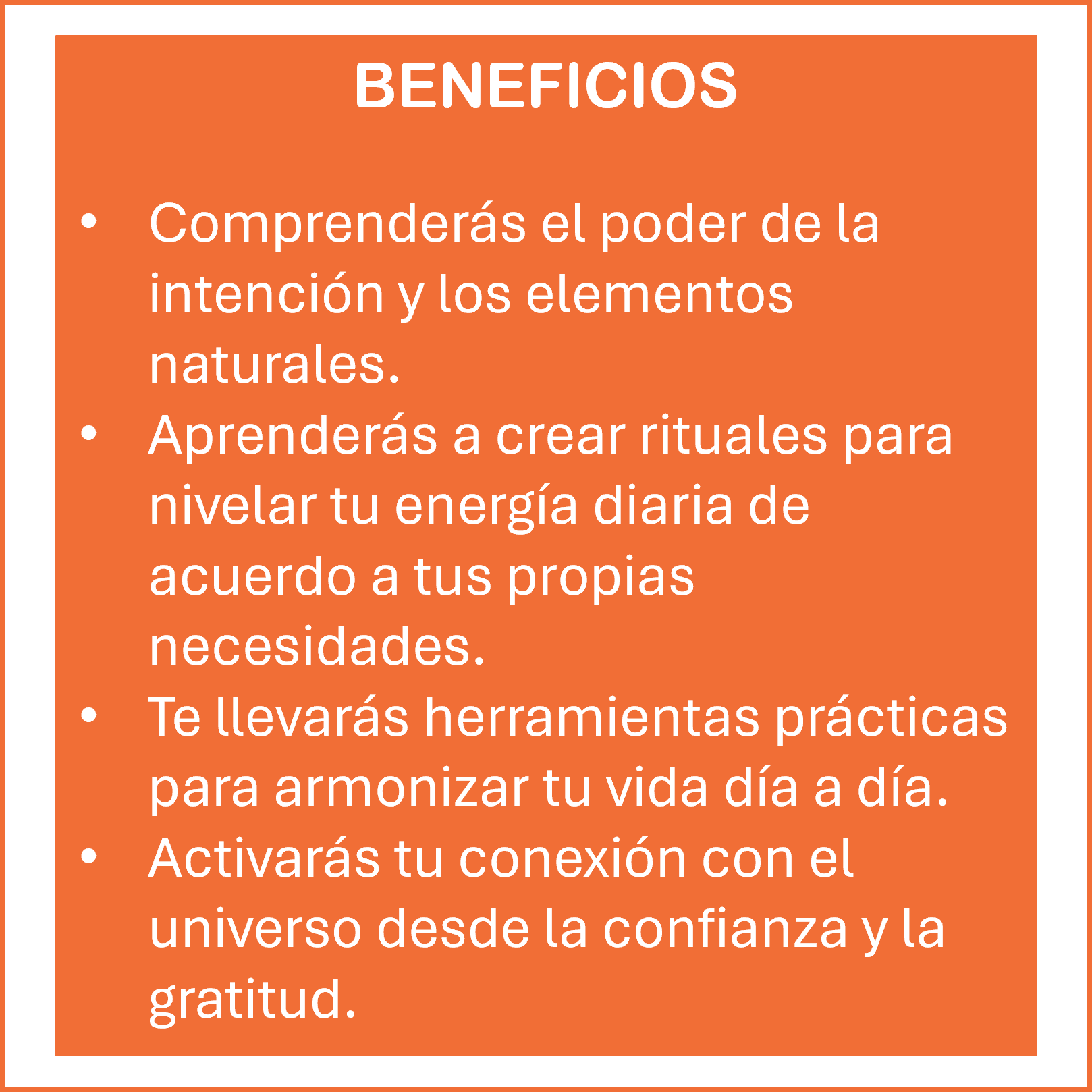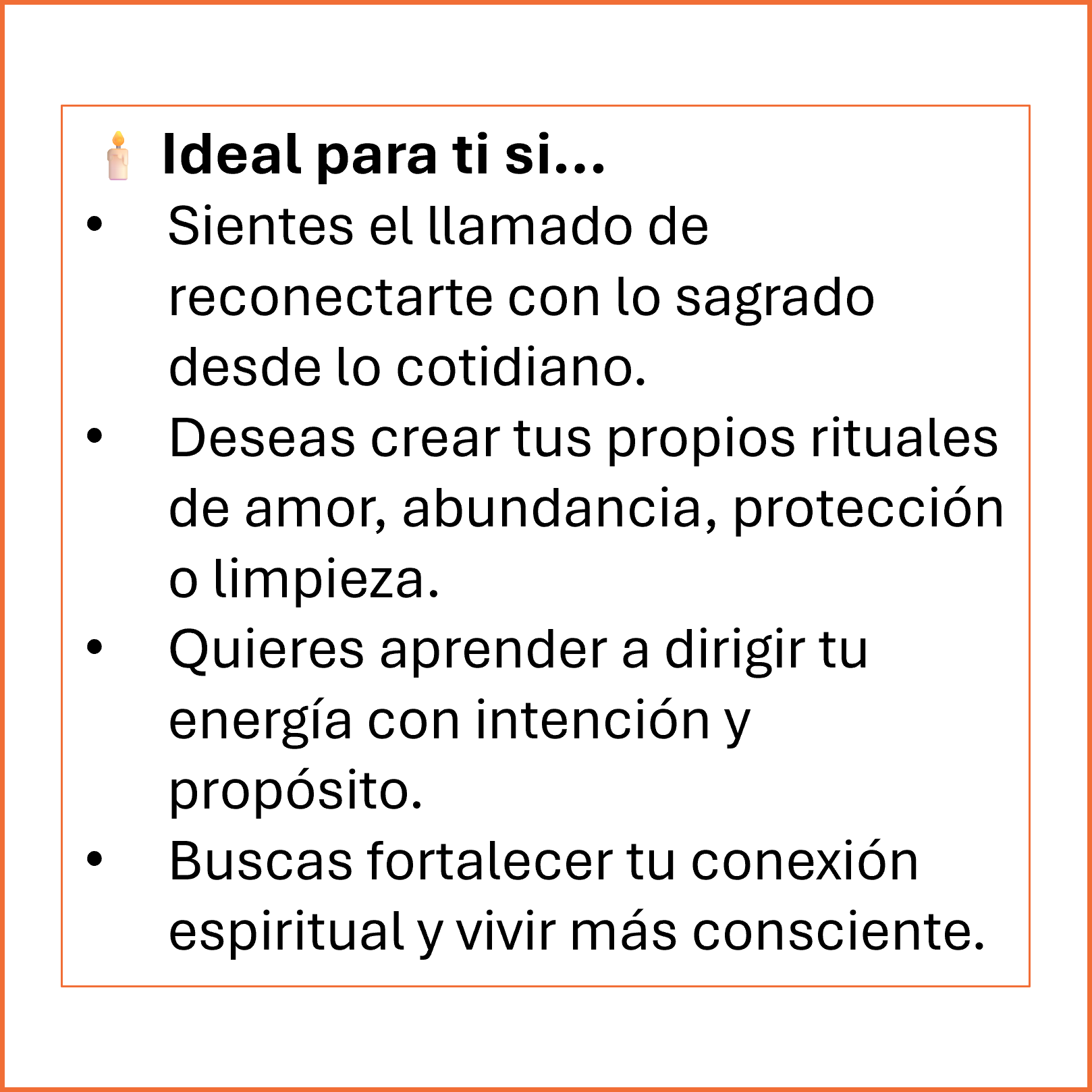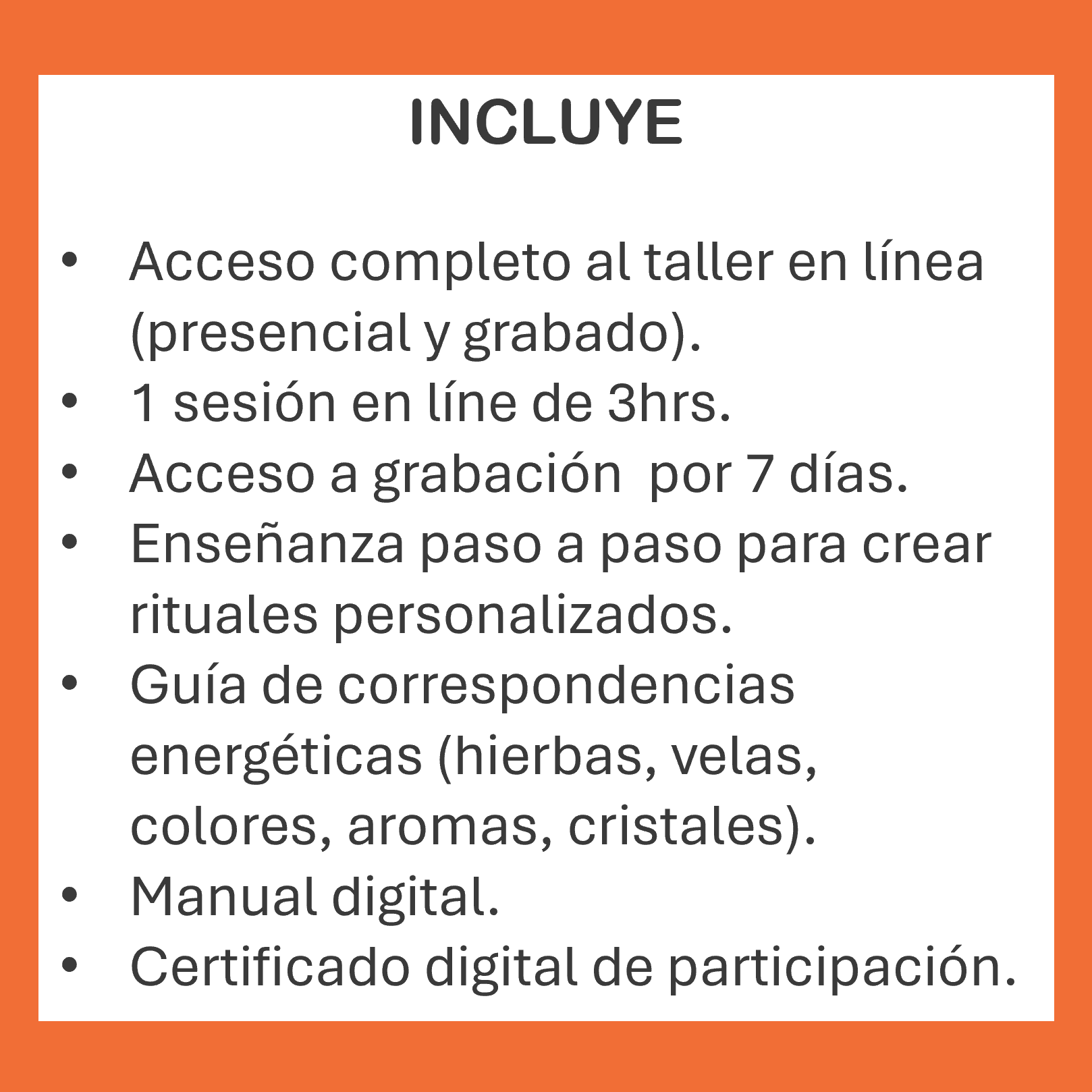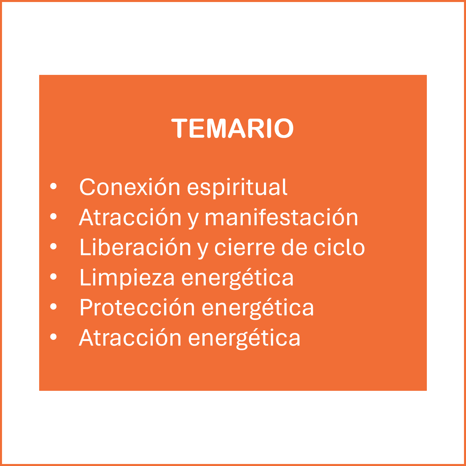 El ritual es un acto consciente que une lo terrenal con lo divino. En este Taller para Crear tus Propios Rituales, se te enseñará a diseñar, consagrar y realizar rituales personalizados que te ayuden a manifestar, liberar, proteger o sanar tu energía de forma amorosa y consciente. Aprenderás a conectar con los elementos, a elegir tus materiales según su vibración, a crear altares y a dirigir tu intención con claridad. Este taller es una experiencia transformadora que te invita a reconocer tu poder creador y convertir cada acto en un gesto sagrado.
